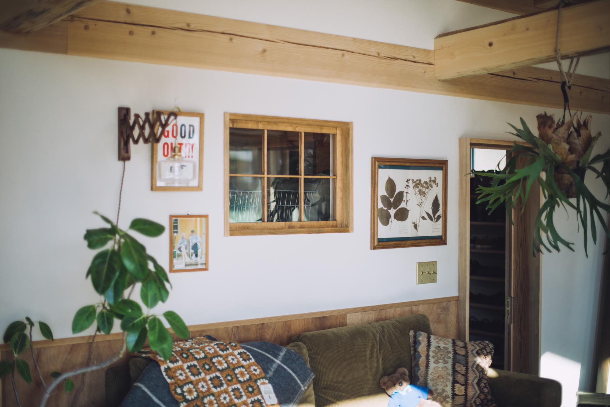 朝の身支度や帰宅後の着替えに重宝する、ダイニング横の衣装部屋。DIYで取り付けた棚には、お気に入りの服や小物がディスプレイされており、「好き」が詰まった空間は日々にちょっとした楽しみやインスピレーションをもたらしてくれる。ジャンルにとらわれず、気に入ったものを自然に集めていくスタイルがベースにあると、置かれるアイテムにも個性がにじむ。