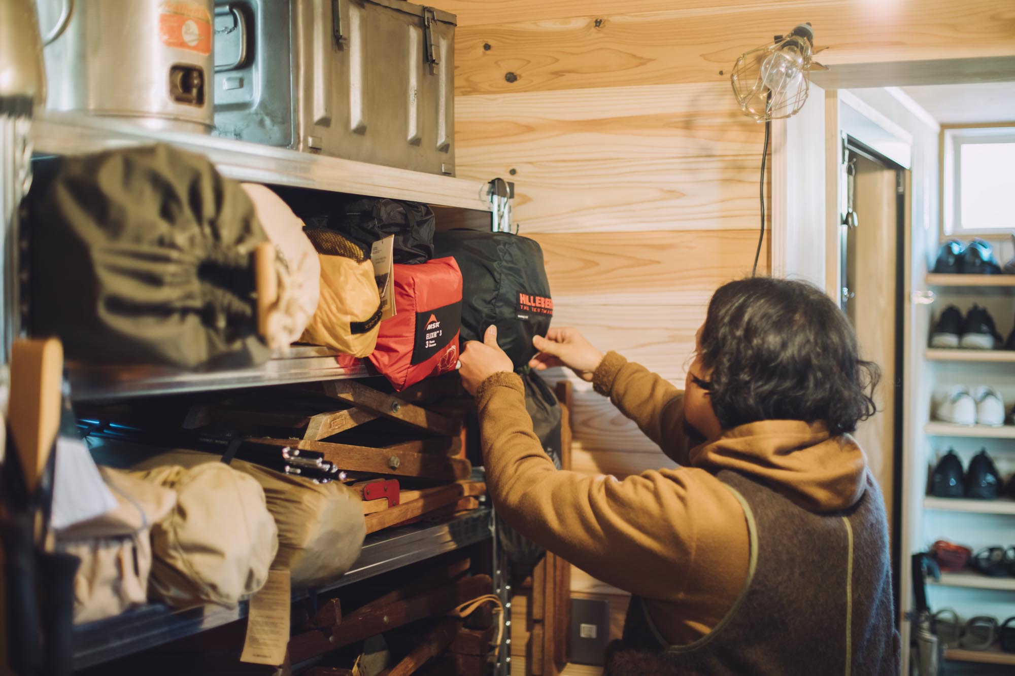 玄関からつながるストックスペースには、キャンプ用品やアウトドアギアをひとまとめに収納。駐車場から玄関、そして庭へとつながるアウトドアをしやすい動線を組み込むことで、靴のまま自由に行き来でき、道具の出し入れもスムーズ。気が向いたときにサッとメンテナンスできる機動性の高さが、趣味へのモチベーションをキープしてくれる。