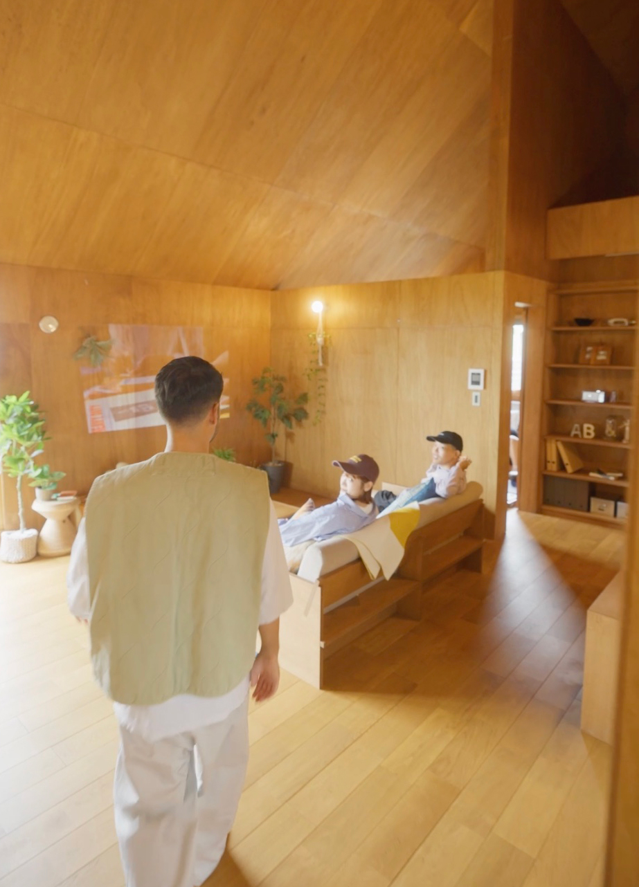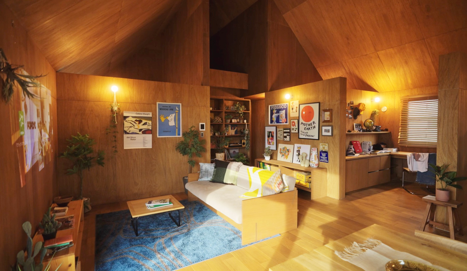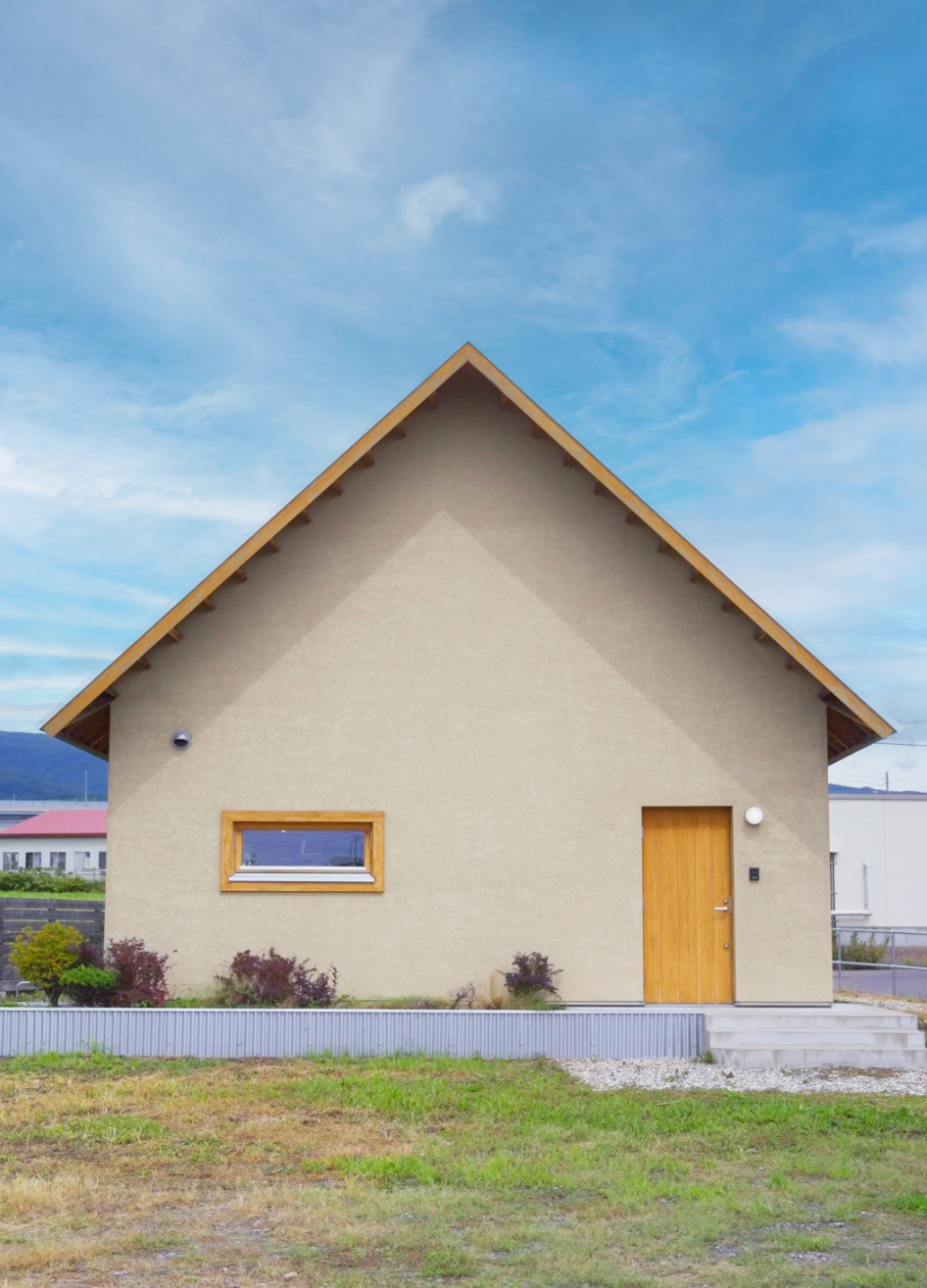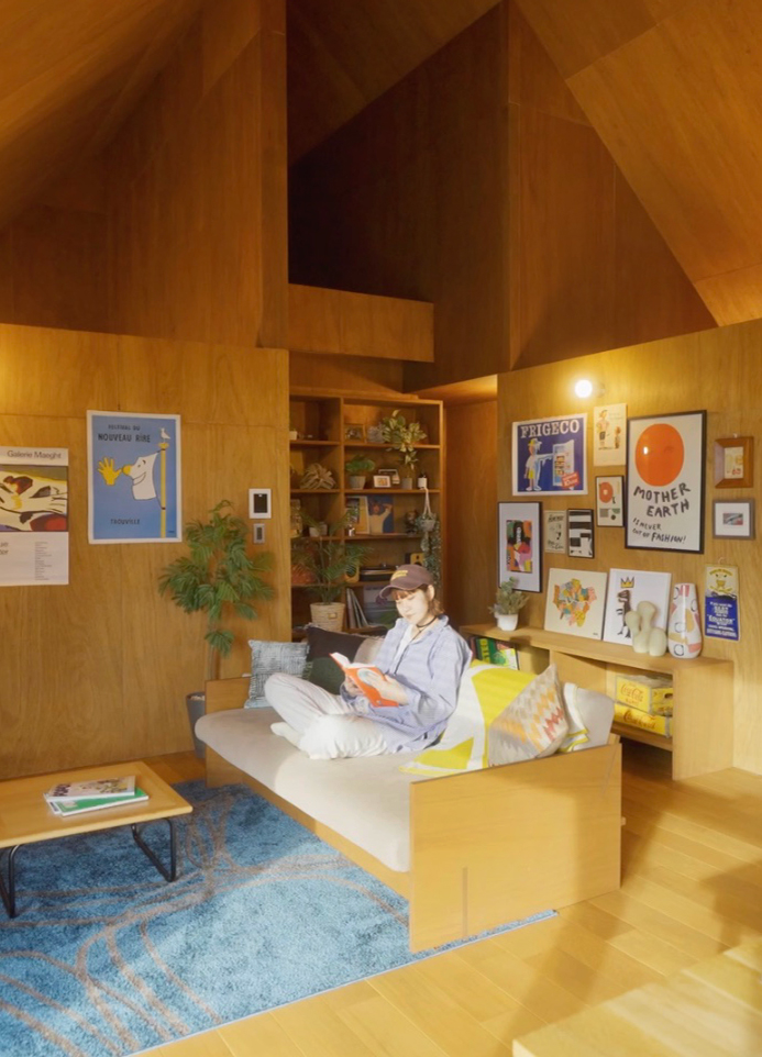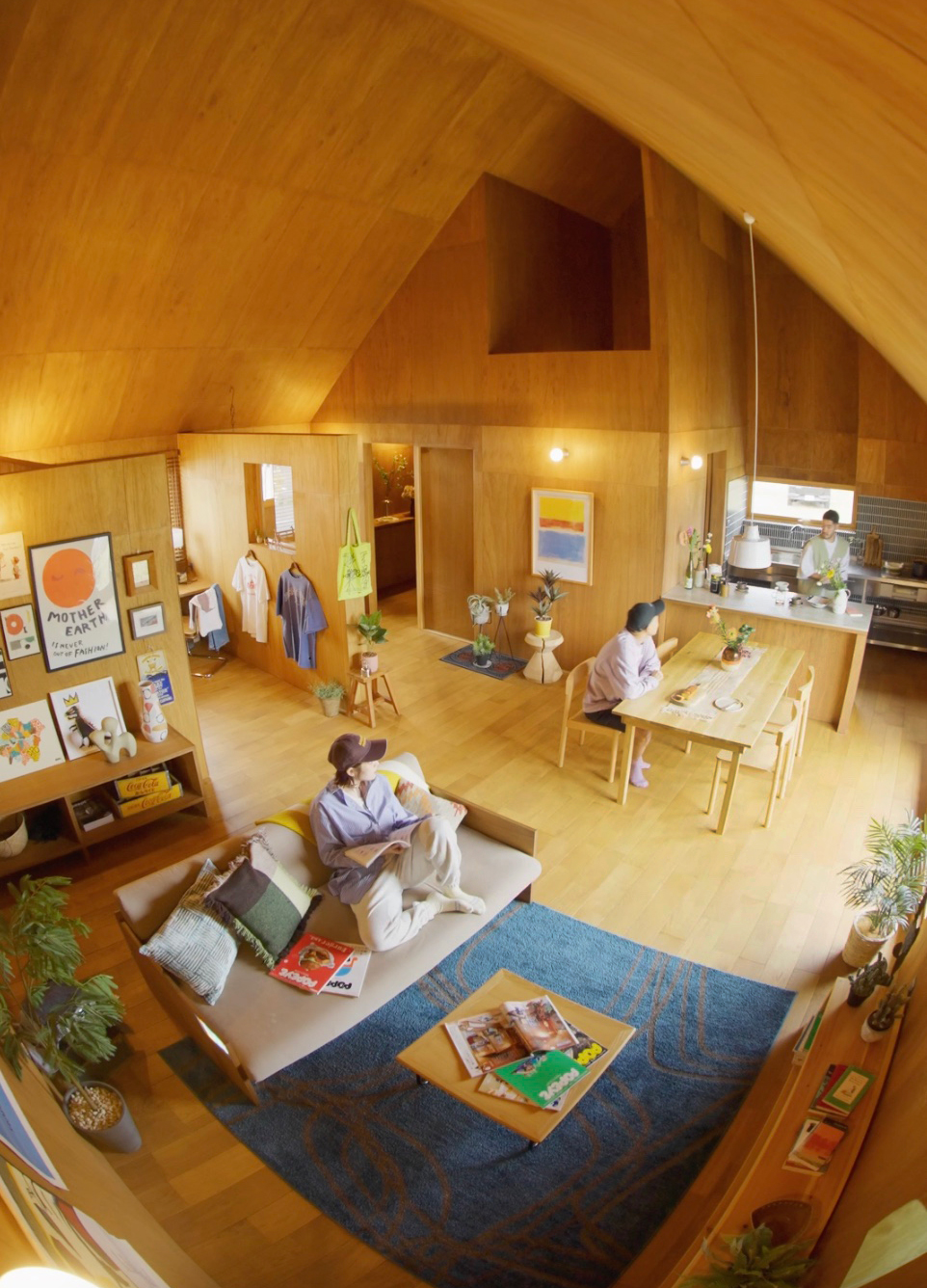 ラフな佇まいの三角屋根の平屋に足を踏み入れると、ラワン合板で仕上げたクラフト感のある空間がお出迎え。飾ったり、塗ったり、アレンジしたり。手を加えるほどに、自分らしさが育っていく。