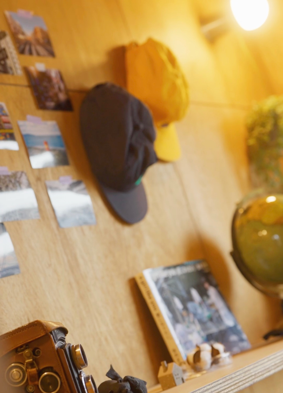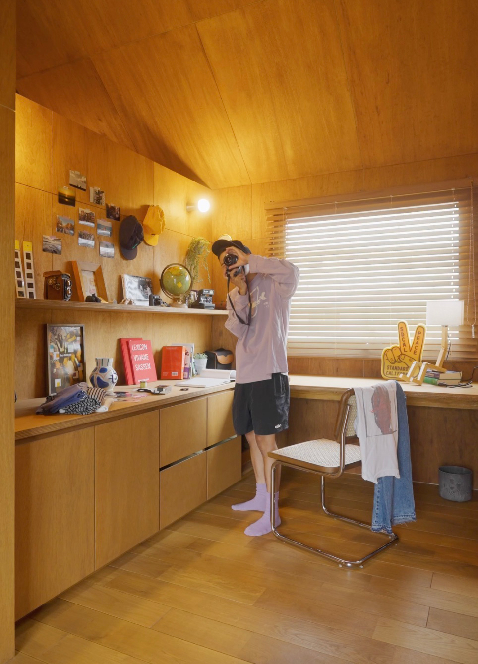 収納たっぷりのL字型デスクは、道具を思いきり広げても作業の流れを邪魔しない。だから、カメラのレンズを磨いたり、撮った写真を壁に並べて眺めたりと、自分だけの楽しみ方はどんどん広がっていく。