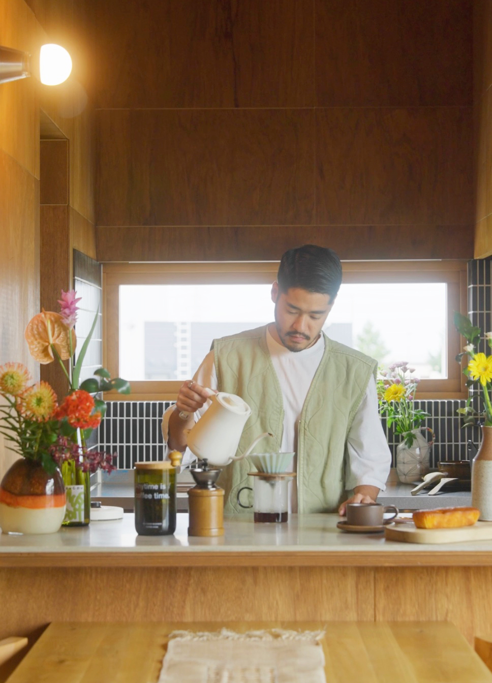 キッチンとダイニングがゆるやかにつながる空間を活かして、淹れたてのコーヒーとお菓子をテーブルへ運べば、そのまま家族や仲間と食卓を囲むことも。そんな何気ない動線の心地よさも、Mr.Standardらしさのひとつだ。