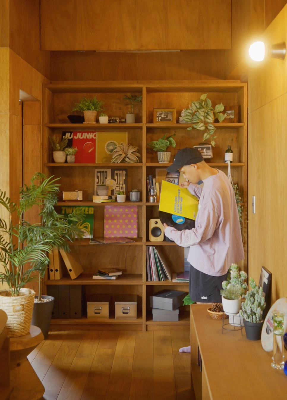 横にも縦にも大きくスペースをとった棚は、飾るモノを選ばない自由さも魅力。レコードを置いて音楽を流したり、植物を飾って水をやったり。