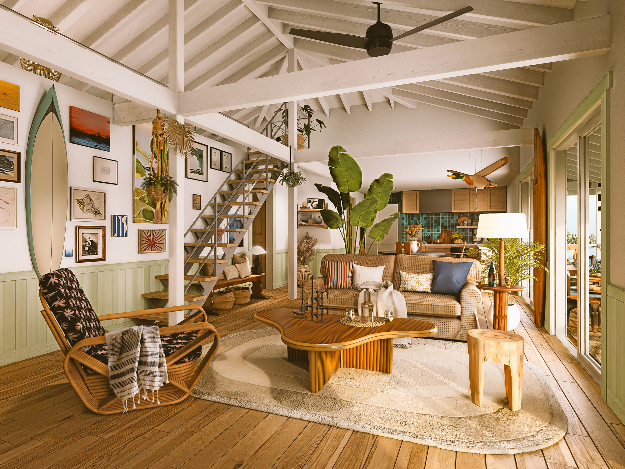 ハワイの街並みに溶け込むようなリラックス感のある平屋スタイルは、“自然体でラフな暮らし”をそっと後押ししてくれるはず。仲間と気ままに集まれる海辺のドライブインのように、肩の力を抜いてワイワイ過ごせる住まいだ。