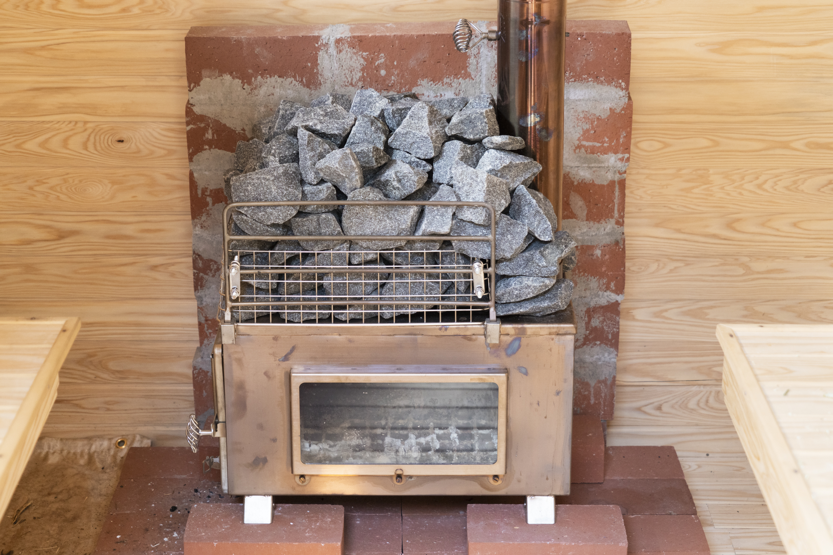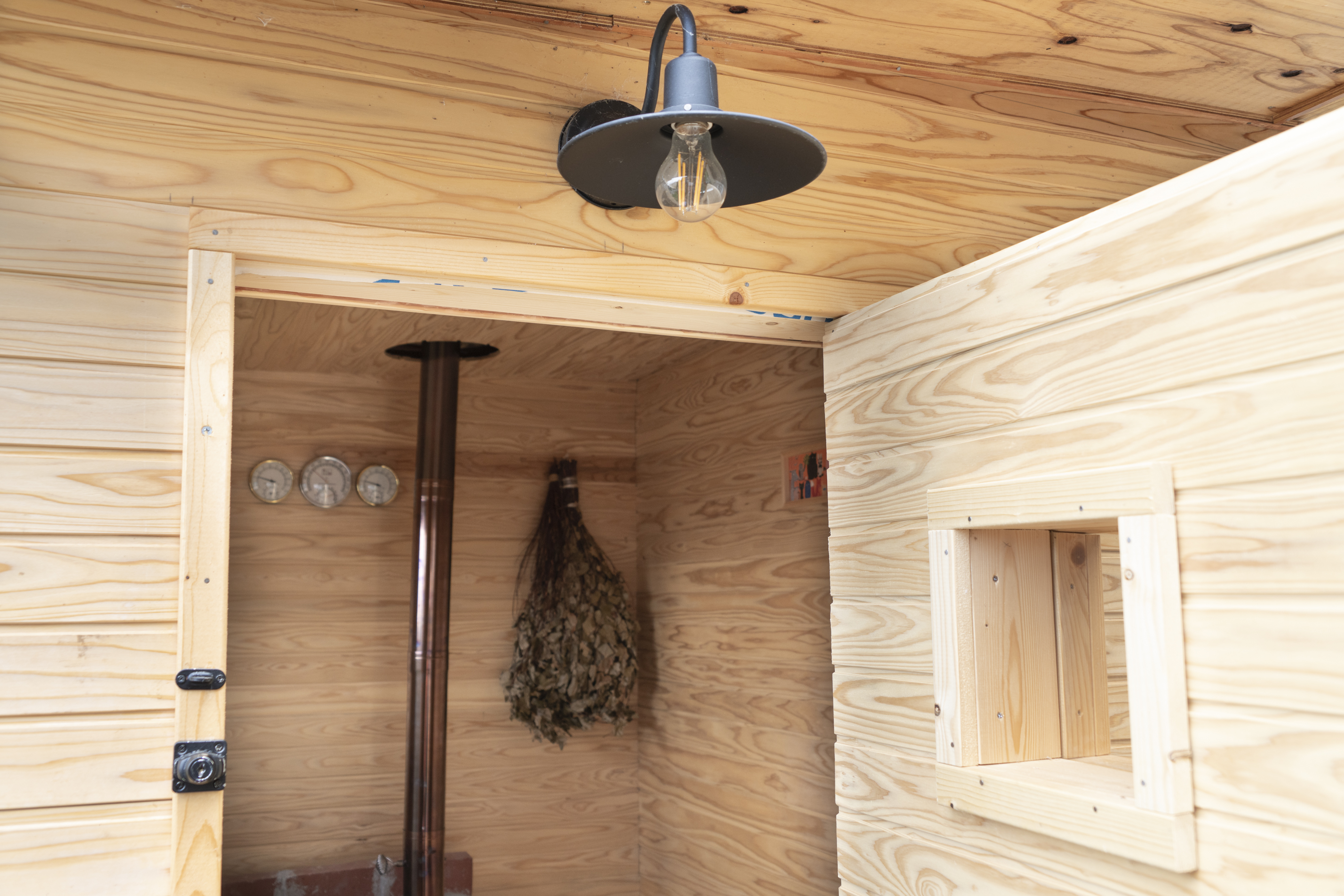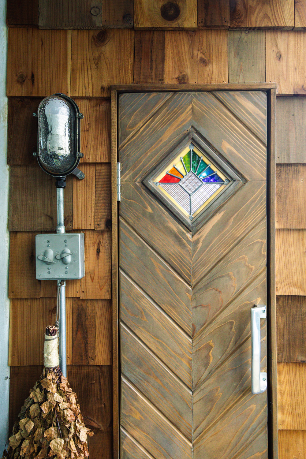 圧巻なのは、ベランダにDIYで建てられた本格的なサウナ小屋だ。フィンランド製のストーブをセレクトし、外壁から内装まで全て手作り。ヘリンボーンのドアに自作のステンドグラスをあしらうこだわりぶりには驚かされる。大人3人が余裕で入れる広さは、自宅のプライベートサウナとして申し分ないクオリティだ。