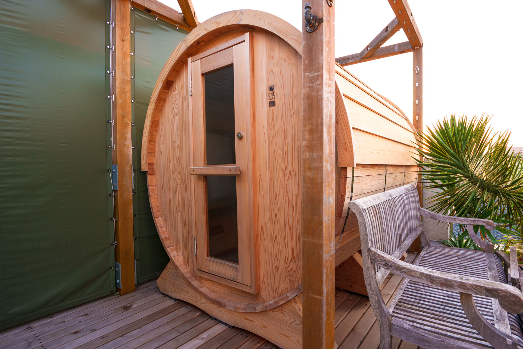 鹿児島で見つけたのは「借景とサウナ」の贅沢な関係。お気に入りの家具に囲まれた部屋にテントサウナを広げ、窓の外にそびえ立つ桜島を眺めながら“ととのう”を満喫する。宿泊ゲストがサウナで汗を流し、そのままベランダで外気浴を楽しむ——そんな至れり尽くせりな体験が日常にある。