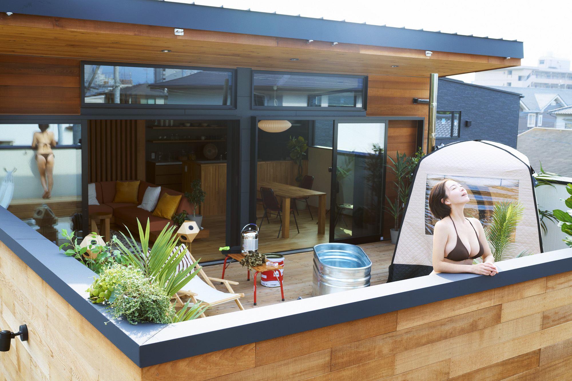 「うちにサウナあるからおいでよ」なんて、仲の良い友人を気軽に誘えるのも、そこが気取らない「家」だからこそ。 デッキに降り注ぐ陽光を感じながら冷えたドリンクを片手に外気浴を楽しむひとときは、まさに非日常が日常の延長線上に現れる瞬間。野外サウナさながらの開放感を、等身大の自分のままで堪能できるのが、この家の何よりの面白さだ。